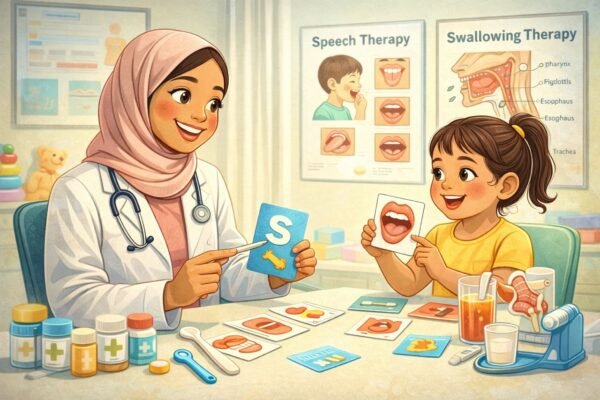 - تقييم شامل متعدد التخصصاتلغة، كلام، بلع، صوت، مهارات حركية، تكامل حسي، قدرات معرفية وسلوك